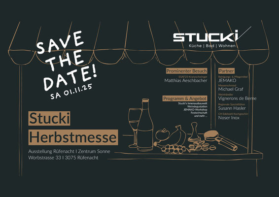 Am Samstag, 01. November 2025 lädt Stucki Küchen herzlich zur Stucki Herbstmesse in den Ausstellungsäumen in Rüfenacht ein. Nutze die Gelegenheit, neue Produkte u.a. unsere Weine kennenzulernen, auszuprobieren und je nach je direkt zu kaufen.