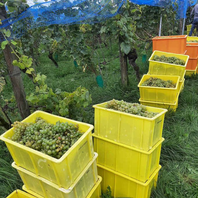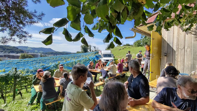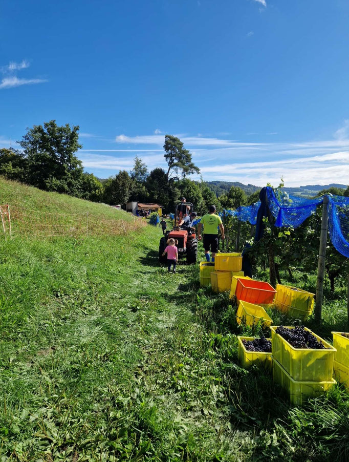 Die Trauben waren reif und dank einem super Rebenjahr bereit ihren Weg in die Weinflasche anzutreten. Die Reihen waren voller perfekter Trauben, sodass mit einem schönen Ertrag rechen können. Dies alles ist nebst Wetterglück unseren tollen Helfer:innen zu verdanken, welche uns durchs Jahr immer wieder tatkräftig unterstützen.